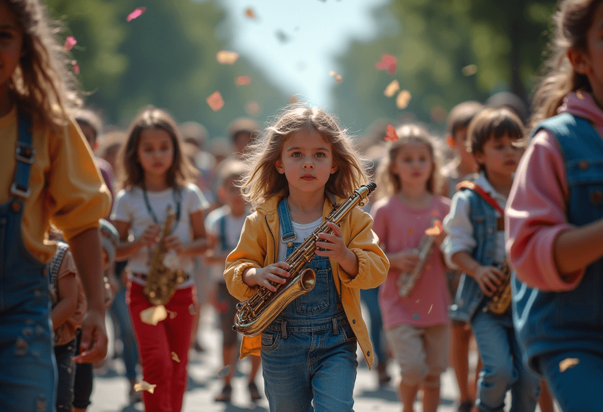 Un défilé musical déjanté où chaque enfant joue de son instrument fait maison (ou tout prêt), invente des pas rigolos, et suit le chef de parade dans une ambiance de mini-carnaval enchanté 🥳✨