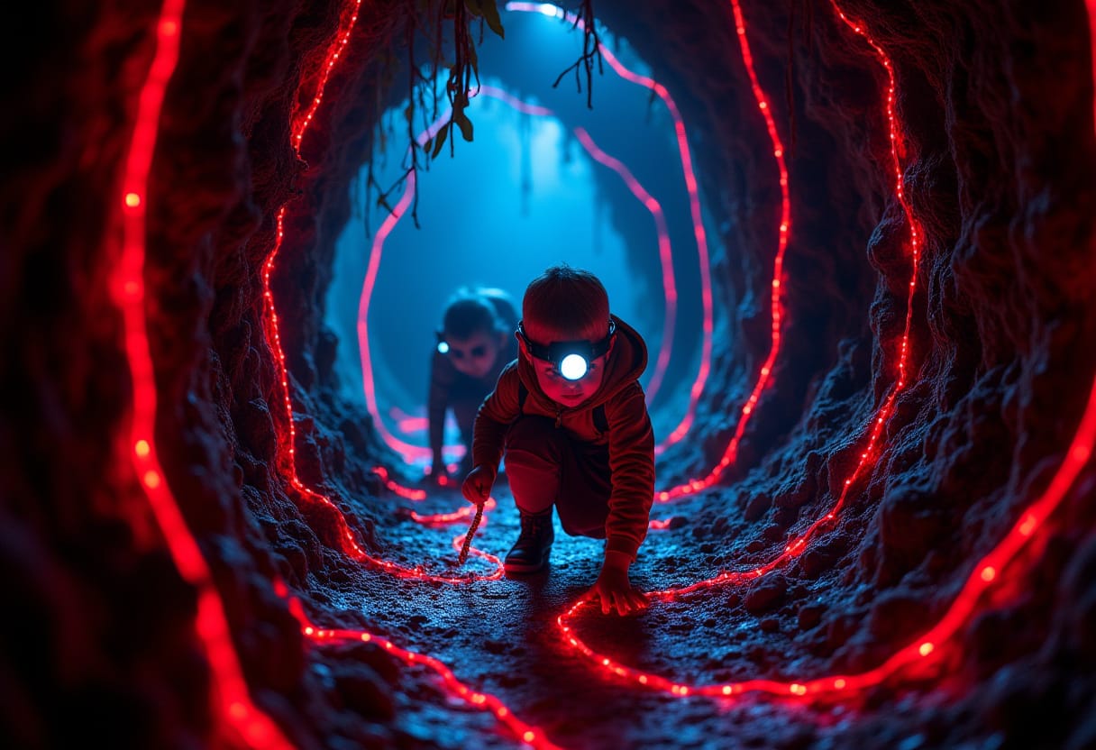 « Explorateurs ! La Grotte Maudite vous attend… Une erreur, un faux mouvement, un genou trop haut, et PAF ! Vous touchez un laser invisible. À vous de ramper, sauter, contourner sans déclencher l’alarme ancestrale. Enfilez vos lampes frontales… et que la discrétion soit avec vous. »