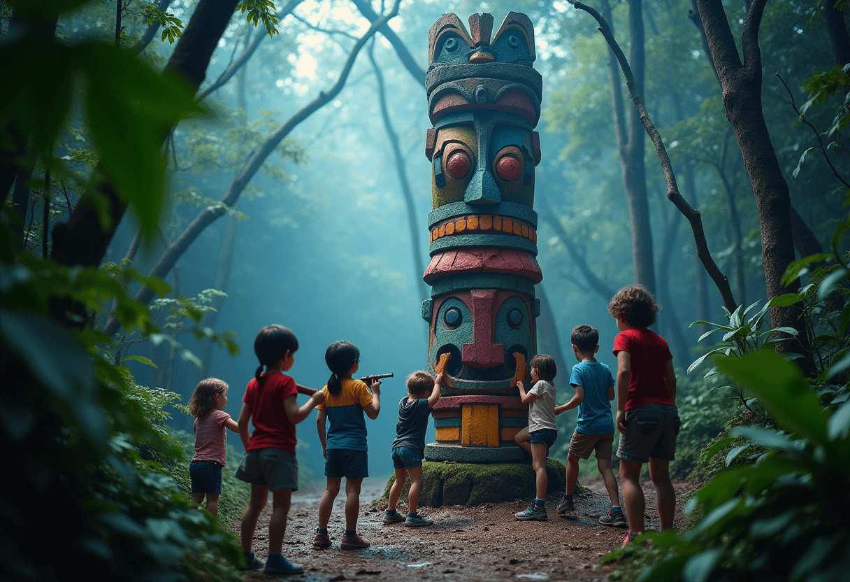 🌟 Bonus ambiance : joue une musique mystérieuse avec des tambours tribaux, installe quelques feuilles géantes en papier et donne un nom au totem (ex. : « Waka-Ka », « Tohumba », « Gorok le protecteur »).