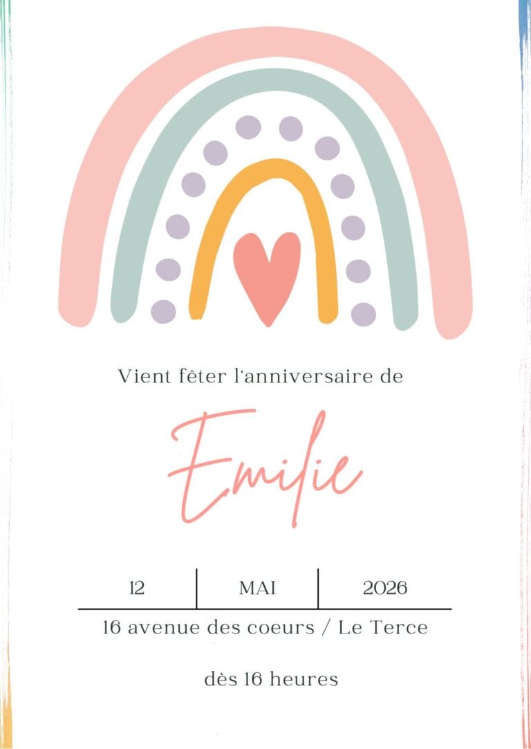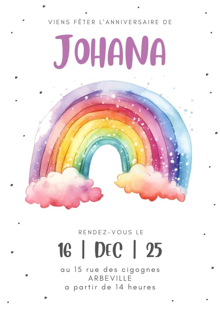 🌈✨ Préparez une fête haute en couleurs avec nos invitations anniversaire arc-en-ciel ! Idéales pour donner le ton dès le premier coup d’œil, ces jolies cartes pleines de gaieté 🌟 annoncent une célébration magique, remplie de rires, de jeux et de bonne humeur. Avec leurs teintes vives, leurs nuages tout doux ☁️ et leur style tendre et joyeux, elles feront briller les yeux des enfants… et des parents ! Parfaites pour une fête sur le thème arc-en-ciel, licorne ou tout simplement colorée 🎉, elles transformeront chaque invitation en un vrai petit moment de bonheur. 💌🌈