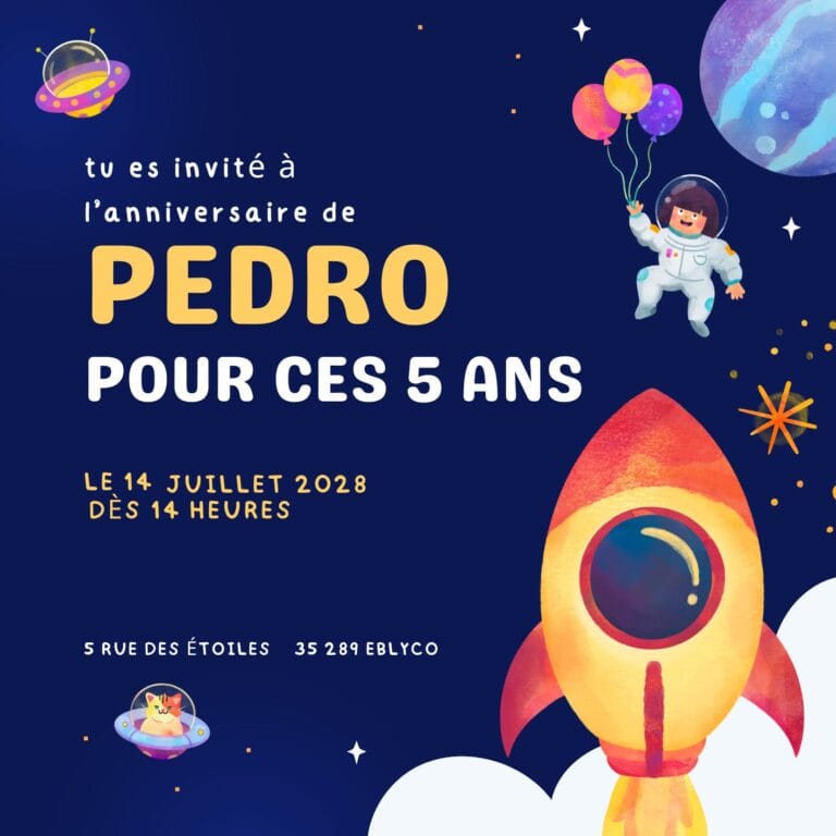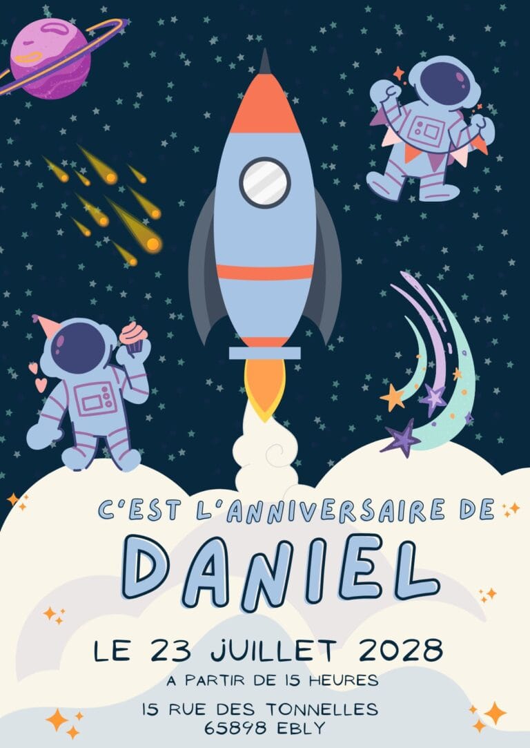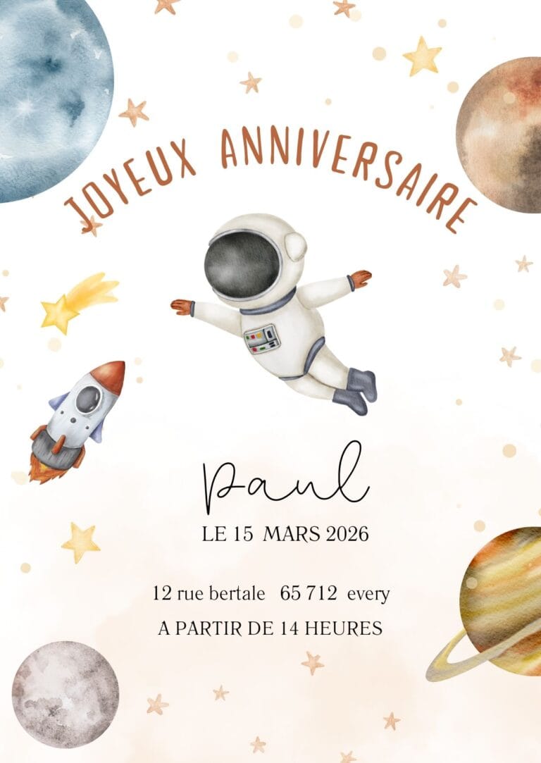 🚀✨ Prêt·e au décollage ? Avec nos invitations d’anniversaire Anniversaire espace, direction les étoiles pour une fête cosmique inoubliable 🌍💫 ! Astronautes en herbe, fusées colorées, planètes rigolotes et étoiles scintillantes s’invitent sur ces cartes pleines d’imagination. Parfaites pour les enfants qui rêvent de galaxies lointaines, d’extraterrestres gentils ou de grandes aventures interstellaires 🛸👨🚀, elles donnent le ton d’un anniversaire futuriste et fantastique. Une fois reçue, chaque invitation devient une mission : rejoindre la fête pour une journée… tout simplement extra-orbitaire ! 🪐🎉