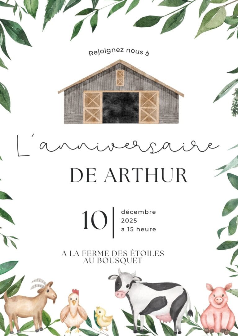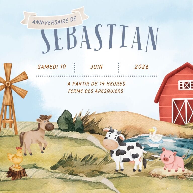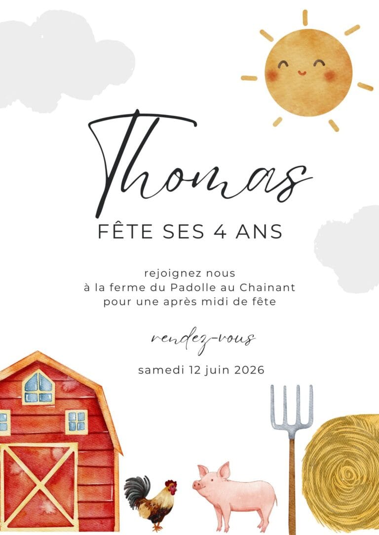 🐷🐔 Bienvenue à la ferme ! Avec nos invitations Anniversaire ferme, offrez à votre enfant une fête au grand air, pleine de rires et d’animaux rigolos 🐮🚜. Poules, vaches, moutons et petits cochons s’invitent sur ces cartes adorables, aux couleurs douces et joyeuses. Parfaites pour les enfants qui aiment la nature, les tracteurs ou les animaux de la ferme, ces invitations annoncent une journée pleine de jeux, de gourmandises… et de bonne humeur ! 🎉🌻 À envoyer ou à remettre en main propre, elles préparent les invités à une fête authentique, chaleureuse et 100 % fun ! 💌🐣