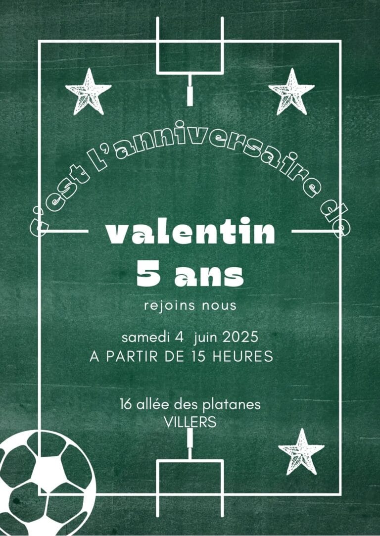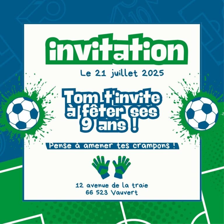 ⚽🥅 Coup d’envoi pour une fête de champion ! Avec nos invitations Anniversaire Foot, les enfants sauront qu’ils s’apprêtent à vivre un match inoubliable rempli de rires, de défis et de fair-play 🏆🎉. Ballons, maillots, trophées et terrains verts donnent le ton d’une célébration sportive et pleine d’énergie ! Que votre enfant soit un buteur en herbe ou un gardien intrépide, ces cartes annoncent une journée placée sous le signe de la passion du jeu. Idéales pour rassembler une équipe de copains autour d’une ambiance de stade, elles transforment chaque invitation en vrai cri de ralliement. 💌🔥