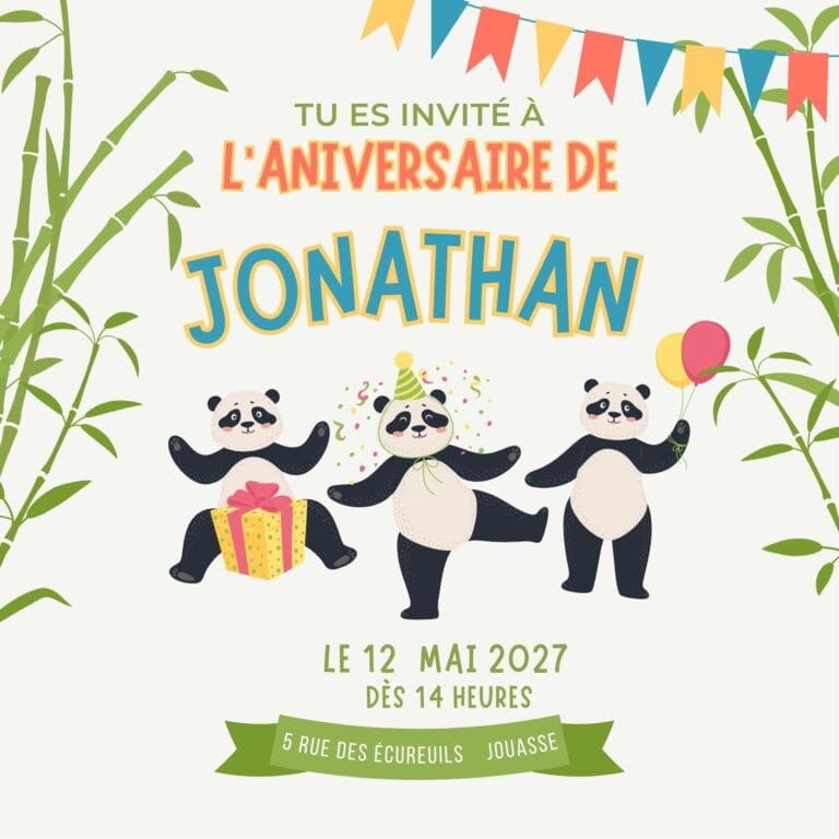🐼🎉 Douceur et câlins sont au rendez-vous avec nos invitations Anniversaire Panda ! Ces cartes craquantes, à l’image de ce petit animal si attachant, annoncent une fête pleine de tendresse, de sourires et de bonne humeur 💌🍃. Idéales pour un anniversaire tout en douceur ou une ambiance zen et joyeuse, elles mettent en scène de mignons pandas dans un univers coloré, amusant et apaisant. Parfaites pour les petits fans d’animaux adorables, ces invitations feront fondre les invités avant même le jour J ! 🎂🐾 Un anniversaire panda, c’est la promesse d’un moment aussi mignon qu’inoubliable. ✨🎈