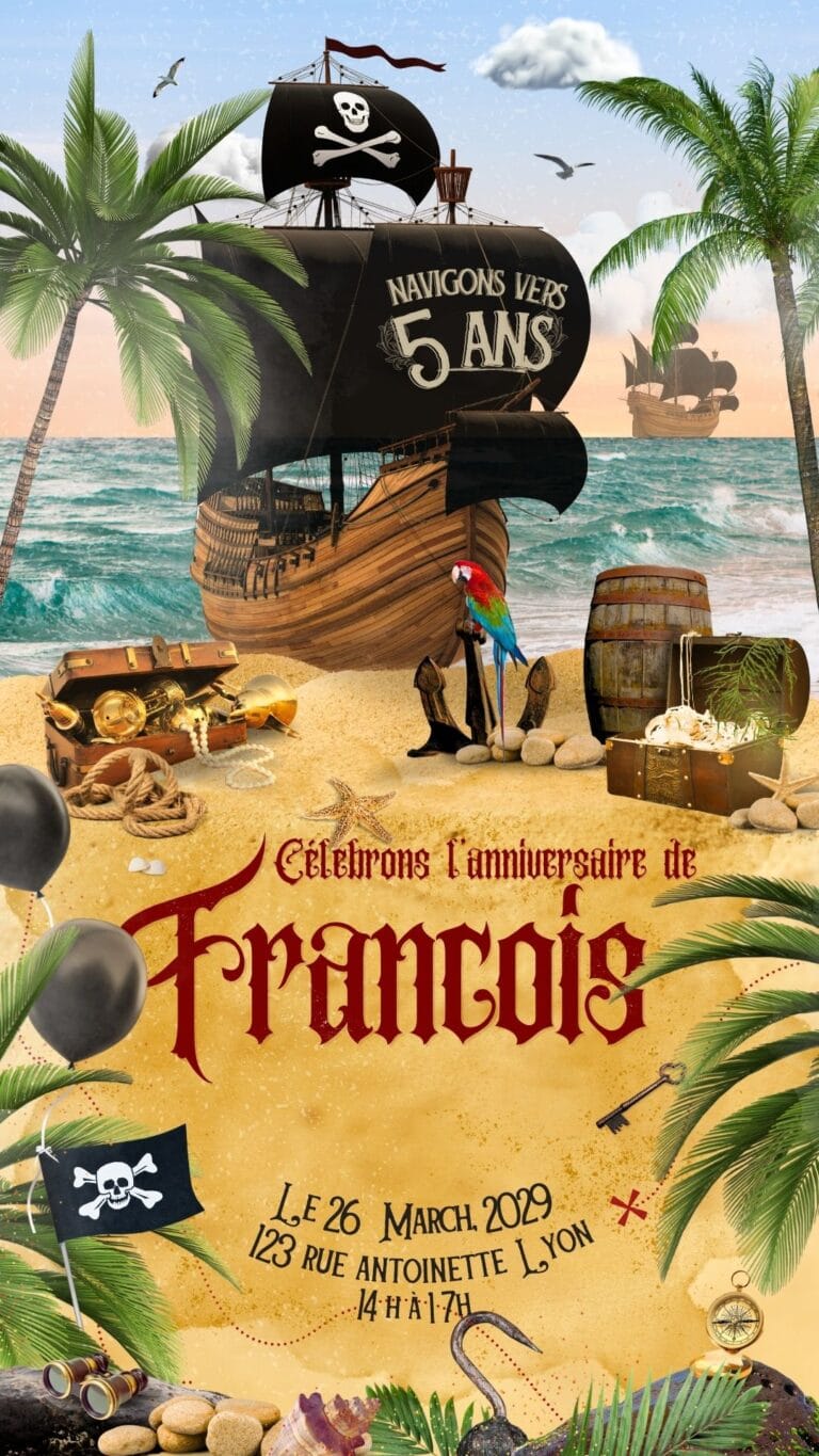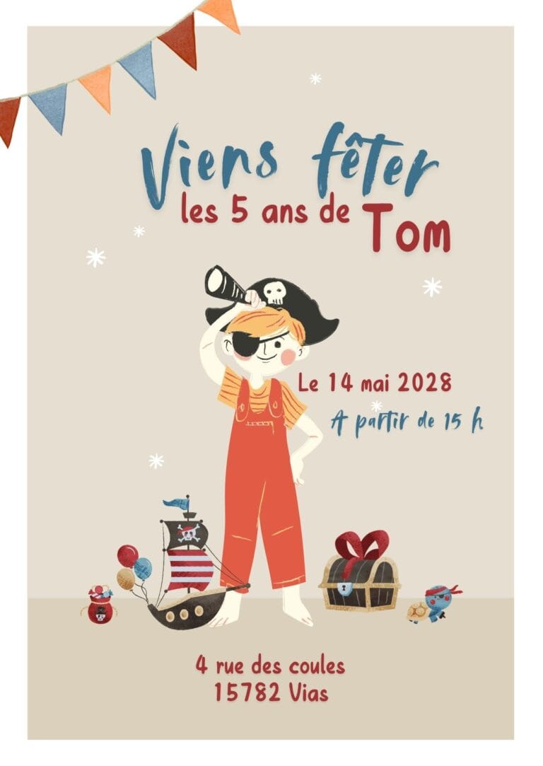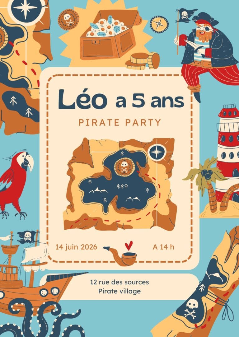đŽââ ïžđ Hissez haut les invitations, lâaventure vous attend ! Avec nos invitations Anniversaire Pirate, les petits moussaillons embarquent direct pour une fĂȘte pleine de trĂ©sors, dâĂ©nigmes et de batailles navales âđ°. Cartes au trĂ©sor, bateaux, perroquets et sabres scintillants annoncent une journĂ©e haute en rebondissements, oĂč chaque invitĂ© devient un membre de lâĂ©quipage. IdĂ©ales pour une fĂȘte pleine dâimagination et de rires, ces invitations plongent les enfants dans lâunivers palpitant des flibustiers. PrĂȘts Ă lever lâancre ? Cap sur un anniversaire qui va faire des vagues ! đđŠ