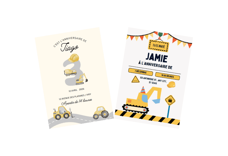 - 📜 Le permis de construire festif : Une invitation en forme de permis de construire, indiquant que “La super fête de [prénom] est en chantier et nous avons besoin de toi pour mener à bien ce projet !”