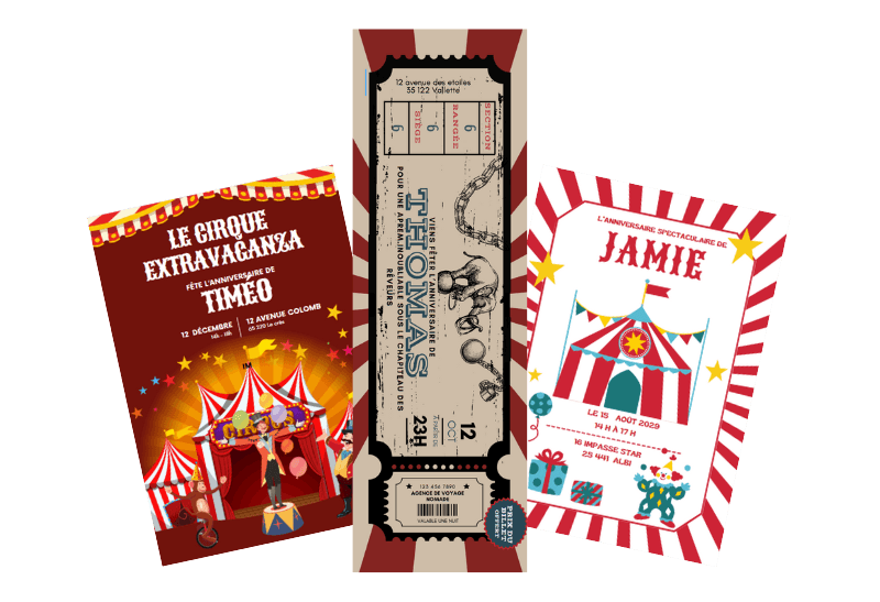 - đ« Billet dâentrĂ©e au grand spectacle : Une invitation en forme de ticket de cirque avec le nom de votre enfant en vedette : « Le Grand Cirque de [prĂ©nom] â Une seule reprĂ©sentation, Ă ne pas manquer ! »